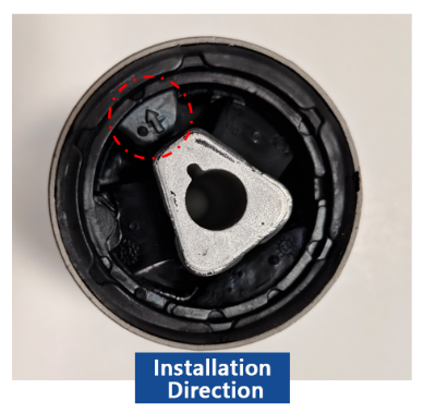Selama pemasangan, pastikan bagian bushing yang kokoh (tidak terbelah) sejajar dengan arah gerak kendaraan secara horizontal ke depan. Jika bushing dilengkapi dengan panah orientasi, panah ini harus mengarah ke depan pada arah pergerakan.