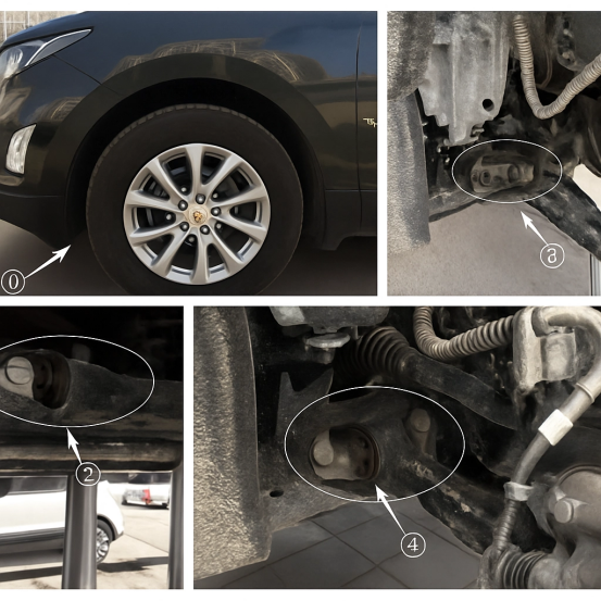 Kumpulan foto sebelumnya menggambarkan kondisi struktural kegagalan bushing lengan kendali suspensi depan pada Chevrolet Equinox. Ini menyarankan pengguna bahwa, seperti yang ditunjukkan pada diagram di atas, komponen struktural yang berpotensi mengalami kegagalan dapat diperiksa dengan memutar roda kemudi hingga terkunci penuh pada posisi ①. Verifikasi keselamatan rakitan busing harus dilakukan melalui foto yang diambil di beberapa lokasi termasuk posisi ②, , dan ④.
