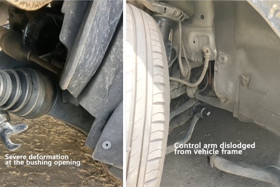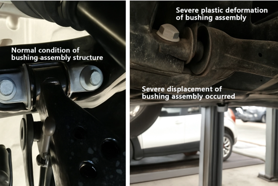 Perbandingan dibuat antara rakitan bushing lengan kontrol yang berfungsi normal (seperti yang ditunjukkan pada gambar kiri bawah) dan rakitan bushing yang rusak (seperti yang ditunjukkan pada gambar kanan bawah). Dia menunjukkan bahwa dengan membandingkan gambar kiri dan kanan di bawah, mudah untuk mengamati bahwa celah pada bushing lengan kontrol normal di sebelah kiri adalah seragam, dan tidak boleh ada pembengkokan atau deformasi yang jelas seperti yang ditampilkan pada gambar kanan. Jika kendaraan menunjukkan kondisi seperti pada gambar sebelah kanan, hal tersebut sudah menimbulkan bahaya keselamatan selama pengoperasian.